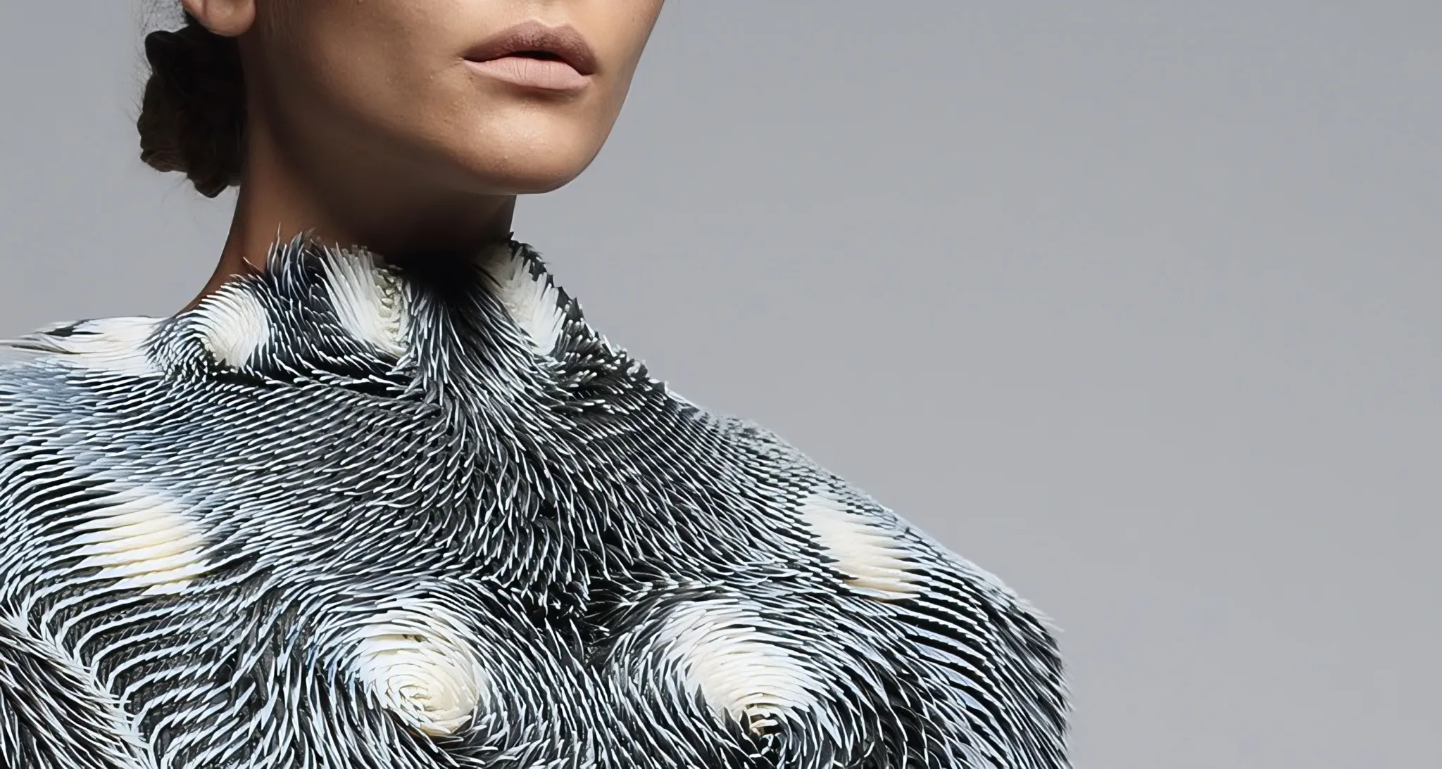 Caress of the Gaze, designed by Behnaz Farahi, is an interactive, gaze-responsive wearable that blurs the line between technology innovation and emotional interaction. Developed with the support of Autodesk Pier 9 and Madworkshop, the project envisions the future of second-skin design through advanced multi-material modelling, AI integration, and 3D printing. Inspired by the fluid behaviour of human skin, the garment dynamically adapts, shifting from soft to rigid in different areas of the body. The unique fusion of fashion, technology, and artificial intelligence, where fabric not only moves with you but also responds to you.