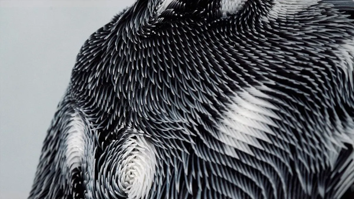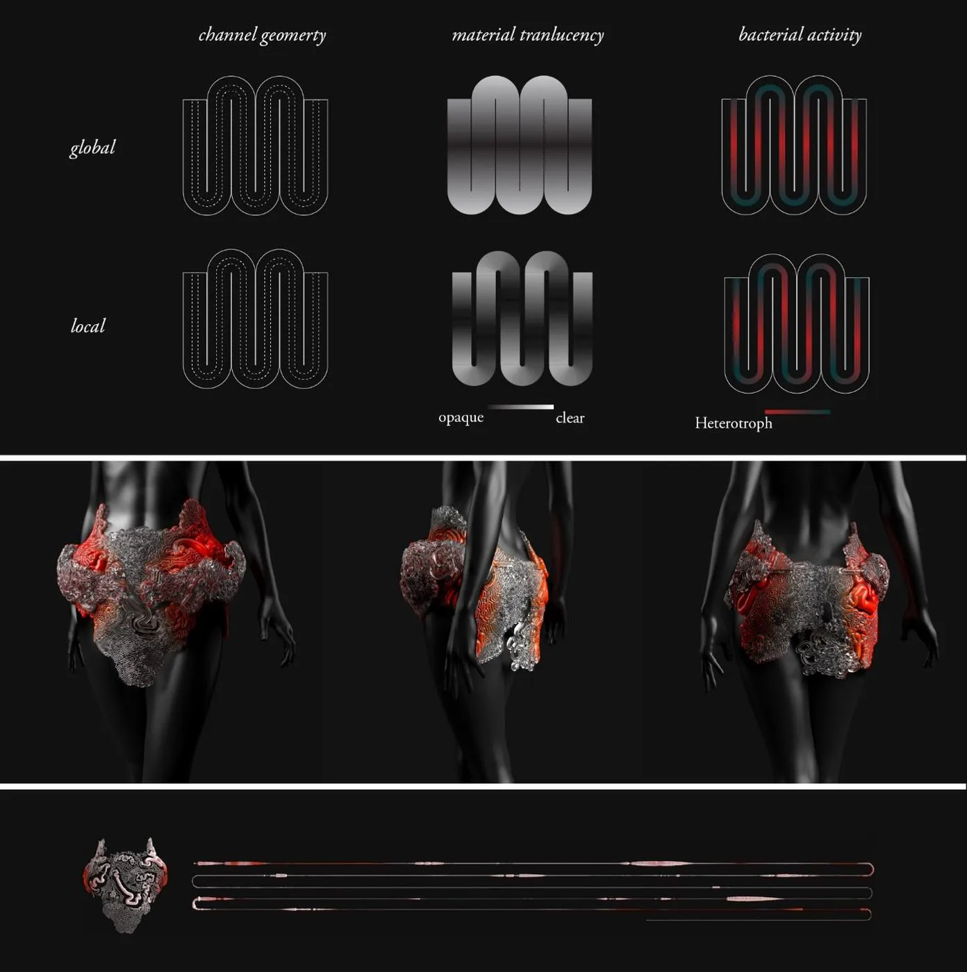 The wearables embody the idea of a living, breathing architecture, where biology, AI, and design merge to create sustaining life directly on the body. Crafted with 3D printing, the intricate structure contains 58 meters of internal fluid channels that use synthetic biology to transform sunlight into useful substances for the wearer, from scents and pigments to biofuel. Designed with generative growth algorithms, its organic form evolves like a living organism, mirroring the logic of natural growth through iterative digital processes. Brought to life using the Objet Connex3 multi-material 3D printer by Stratasys, this masterpiece transforms the human body into a vessel of creation, blurring the boundary between the living and the designed.