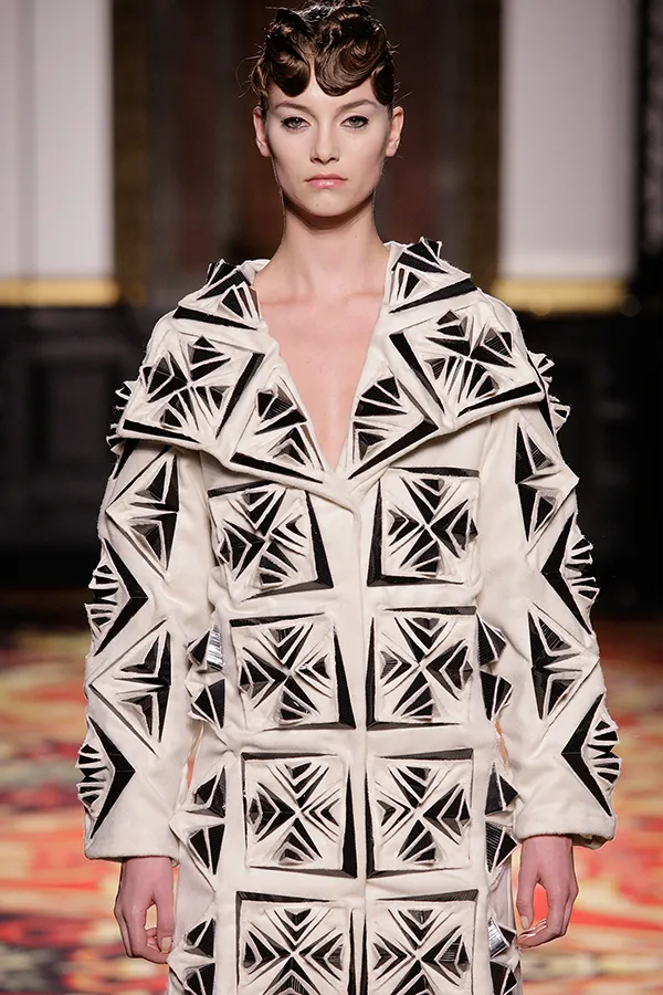 In her Voltage Collection, visionary couturier Iris van Herpen transforms the unseen forces of electricity, magnetism, and energy into breathtaking works of wearable architecture. Electricity plays a central role in the entire collection; electricity becomes more than inspiration, it is the heartbeat of each design. The designer collaborated with an artist and Professor Philip Beesley to develop 3D fabrics for several monochrome silhouettes, whose sensitive antennae vibrate to the energy of the entire body.