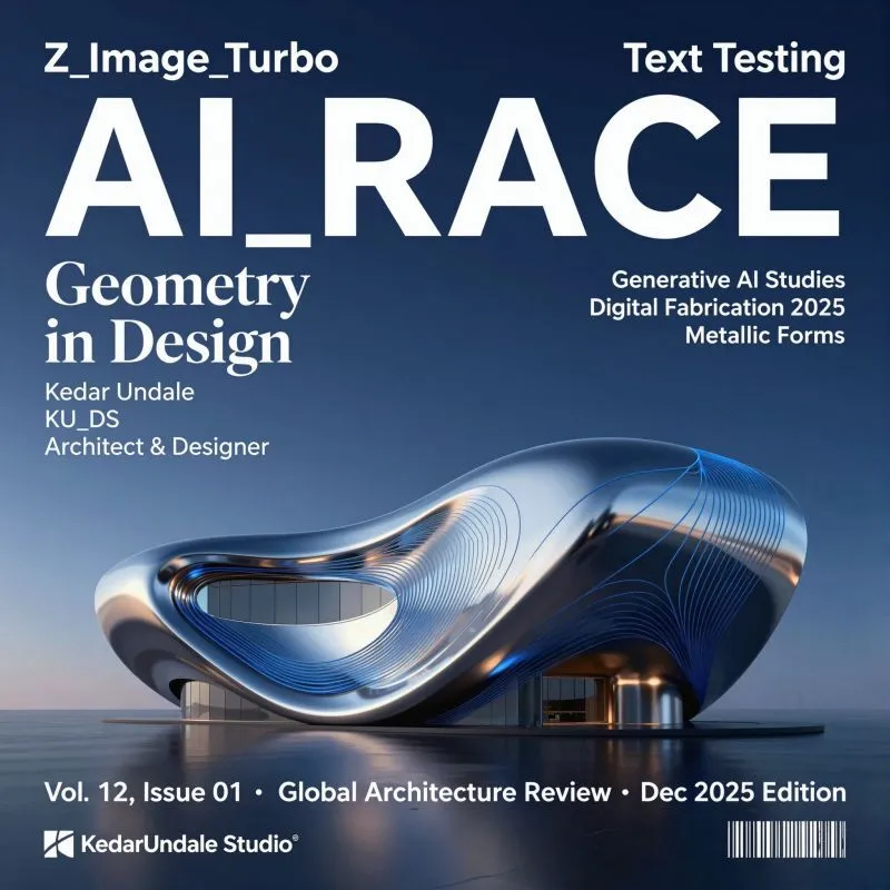 Kedar Undale's work focuses on how generative AI works in architectural representation and visualization workflows. In his Text Testing with Z Image Turbo project, he created an architectural magazine cover titled "AI RACE" to evaluate an open-source model's ability to create photorealistic architecture using structured text.