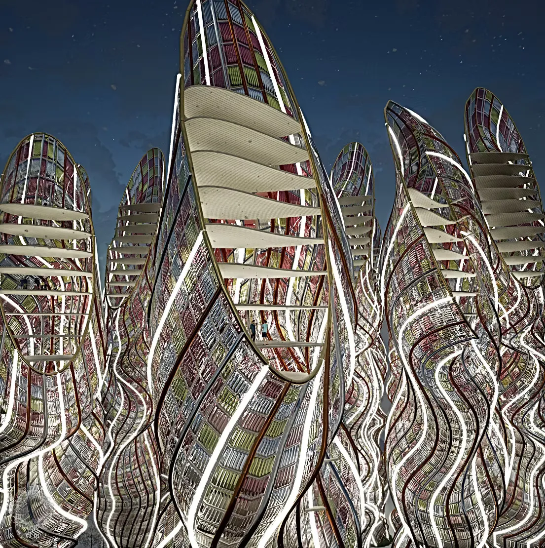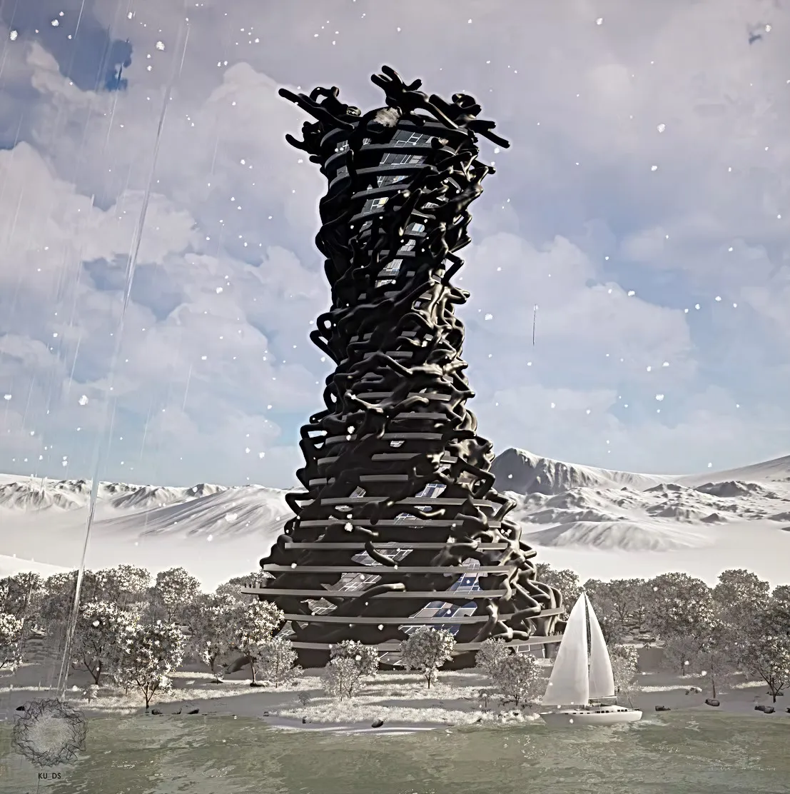 In the Parasite Invasion project, Undale used agent-based systems to generate tentacle-like geometries on a speculative offshore tower. Here, 1,000 computational agents emerge from the ground and connect to points across the structure, demonstrating how emergent behavior can shape building form using Grasshopper3D scripting and Twinmotion visualization.