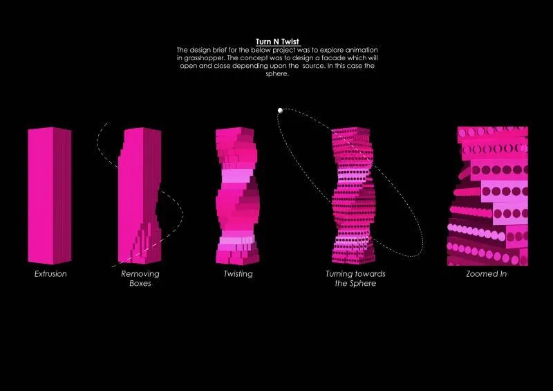 Another project, Turn N Twist, focused on parametric facades and used animation logic inside Grasshopper to drive opening and closing movements. Although the projects vary in scale and context, they share a common design approach that relies on computational systems and digital fabrication to develop concepts, solve problems, and execute technical details.