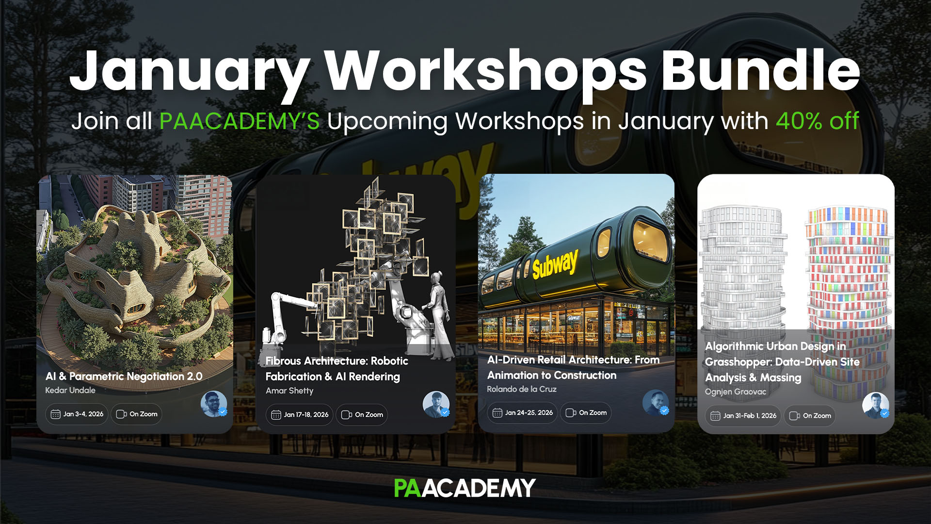 Access all PAACADEMY’s January workshops in one bundle and explore AI-parametric workflows, robotic fabrication, data-driven urban design, and AI-powered retail architecture.