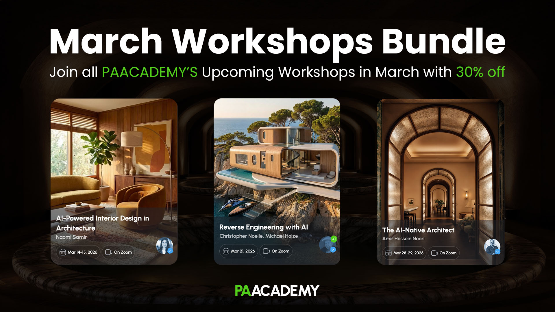 Access all PAACADEMY’s March workshops in one bundle and master integrated AI workflows, reverse engineering strategies, and professional interior design execution.