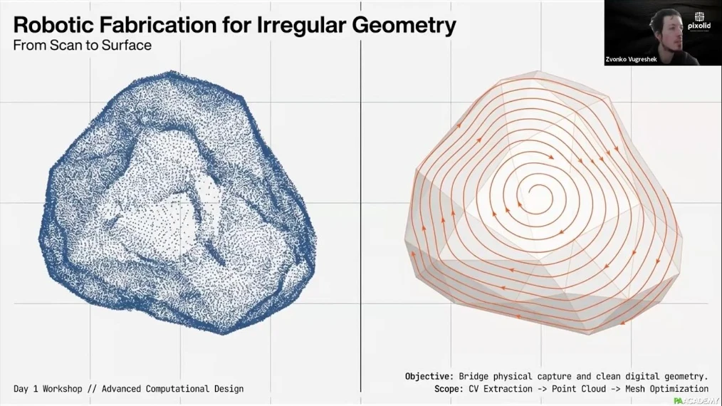 This workshop focuses on scan-to-robot workflows, generating surface-aware robotic toolpaths from irregular geometry and validating them through kinematic simulation.