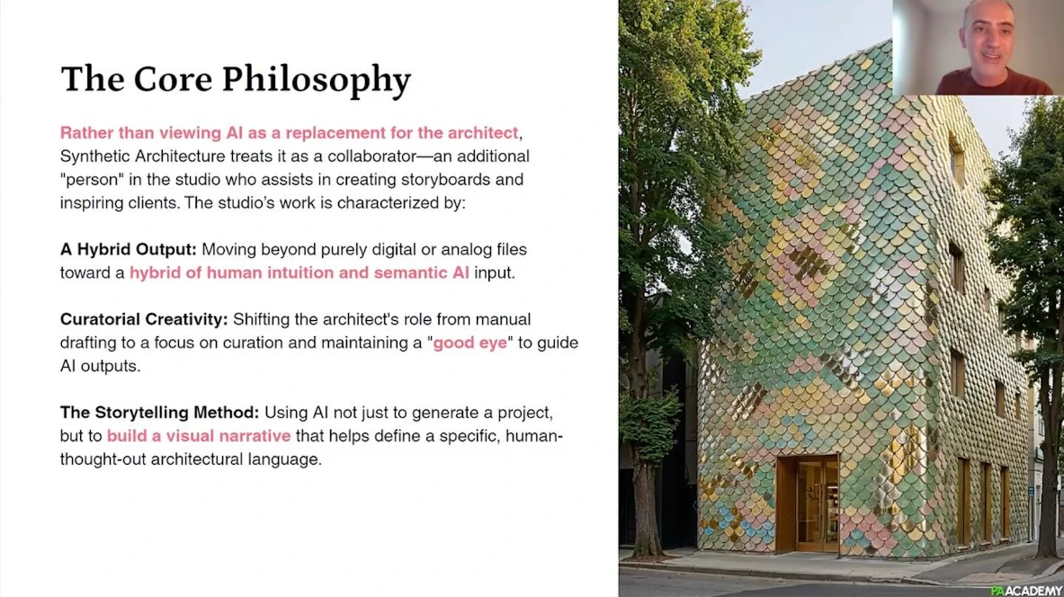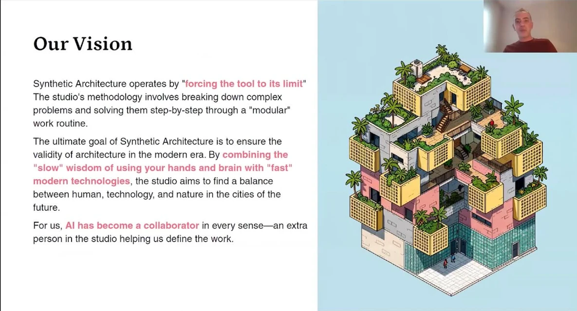 Design tools are evolving faster than ever, and the role of the architect is shifting from form-giver to curator of intelligence. This workshop is a deep dive into Synthetic Architecture Methodology, 25 years of architectural theory and practice, enhanced with AI.